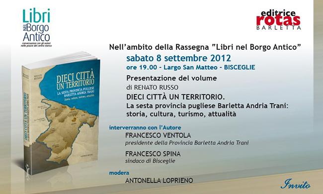 Sabato 8 settembre 2012 alle ore 19,00 nell'ambito della III Rassegna "Libri nel Borgo Antico" a Bisceglie è stato presentato il volume di Renato Russo: 10 Città, un territorio. Sono intervenuti con l'autore: Francesco Ventola, presidente della provincia Barletta-Andria-Trani; Francesco Spina, Sindaco di Bisceglie; ha moderato: Antonella Loprieno.